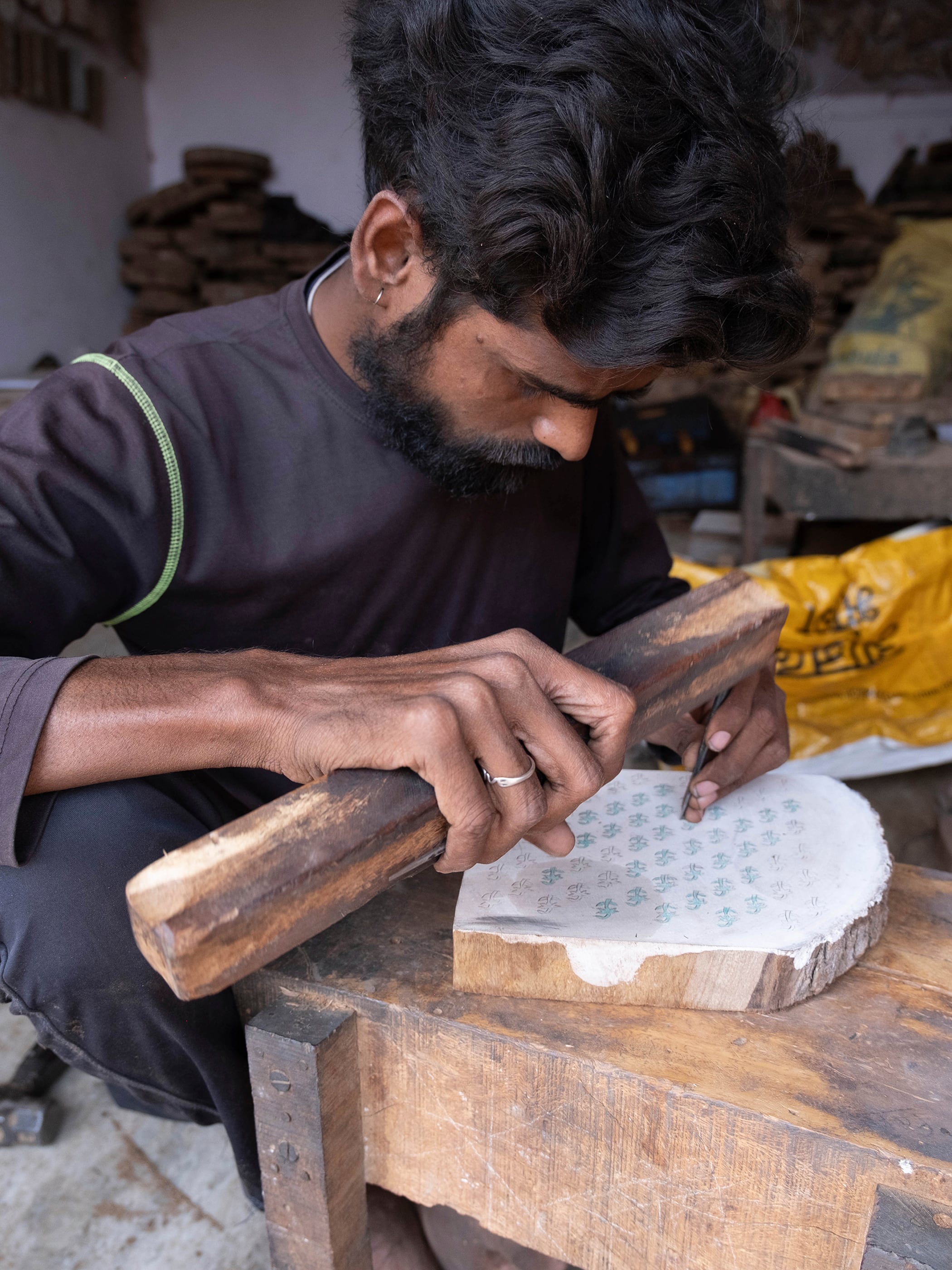 インド・ジャイプール近郊のバグルー村にて、古い鉄と砂糖を発酵させてつくる天然ミネラルと、花や植物の実などから得られる自然染料を用い、マトカシルクに木版(ブロックプリント)で染めを施しています。