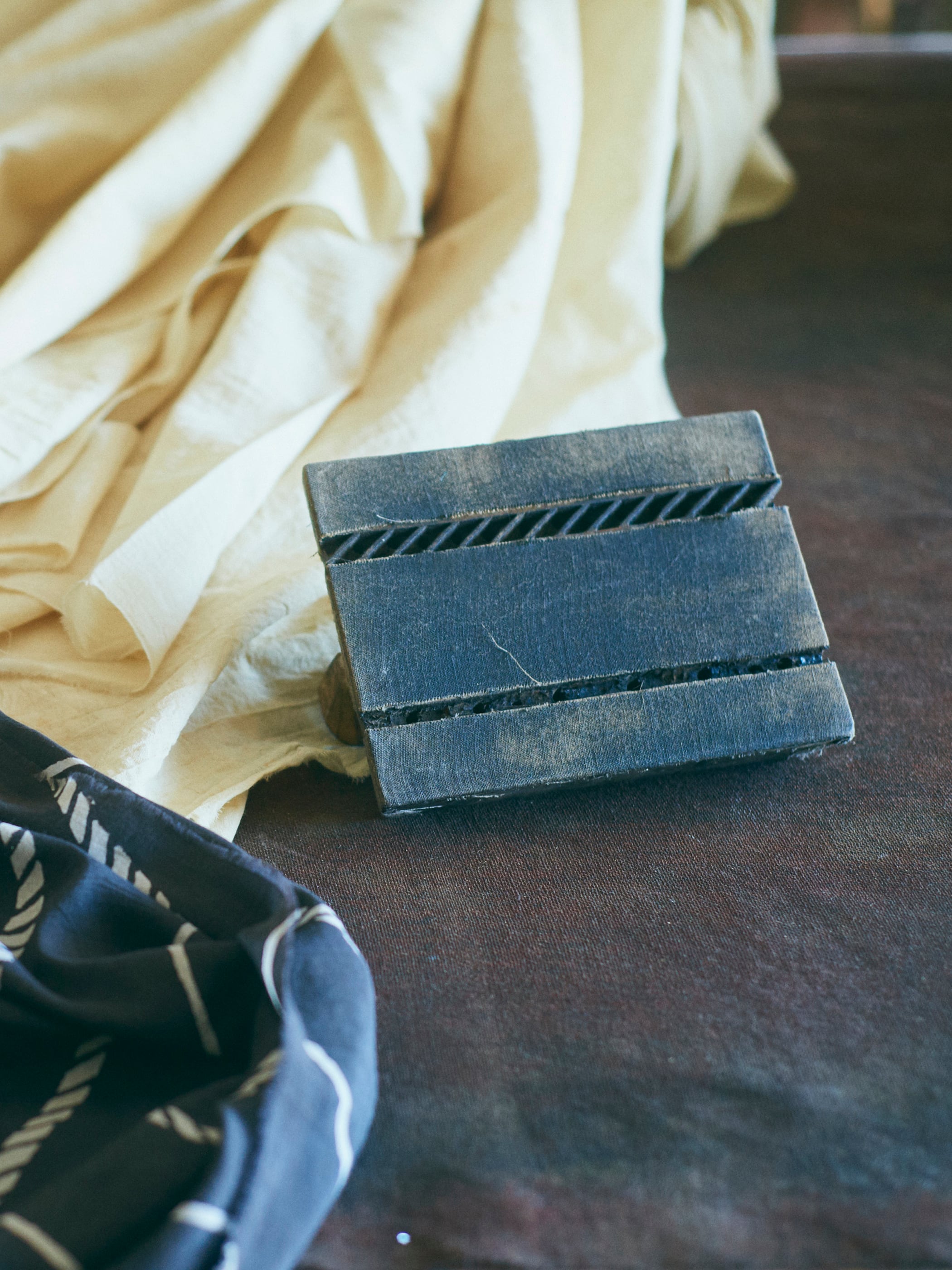 インド・ジャイプール近郊のバグルー村にて、古い鉄と砂糖を発酵させてつくる天然ミネラルと、花や植物の実などから得られる自然染料を用い、マトカシルクに木版(ブロックプリント)で染めを施しています。